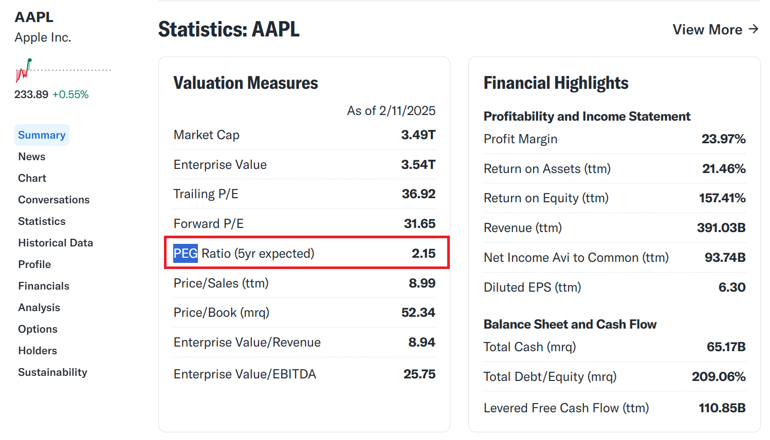 야후 파이낸스에 접속하여 애플의 티커명 AAPL로 검색하면 Statistics 절에서 PEG Ratio 를 찾을 수 있습니다. 조회 시점 기준(25.02.11) 애플의 PEG Ratio 는 2.15 입니다. 동일한 방법으로 엔비디아의 PEG Ratio 는 0.95 입니다.